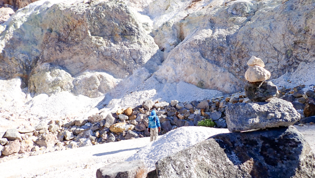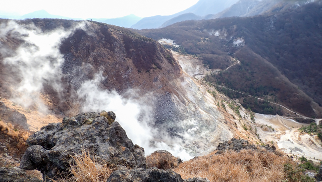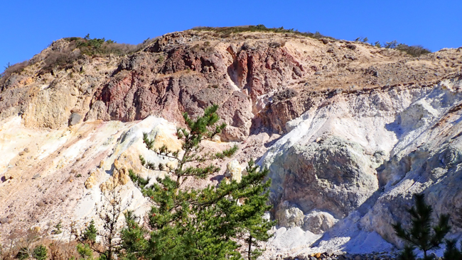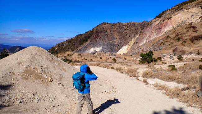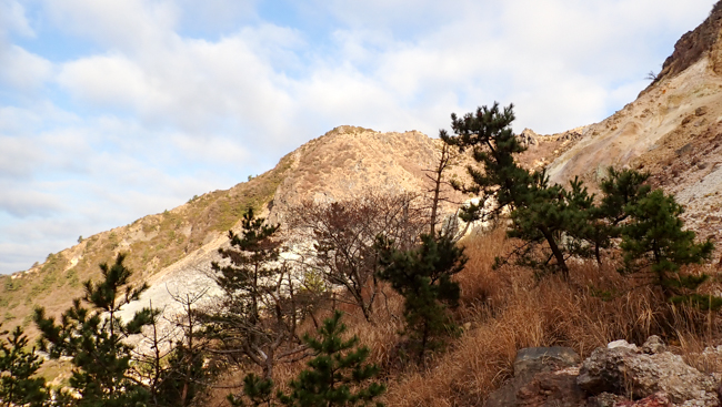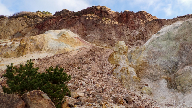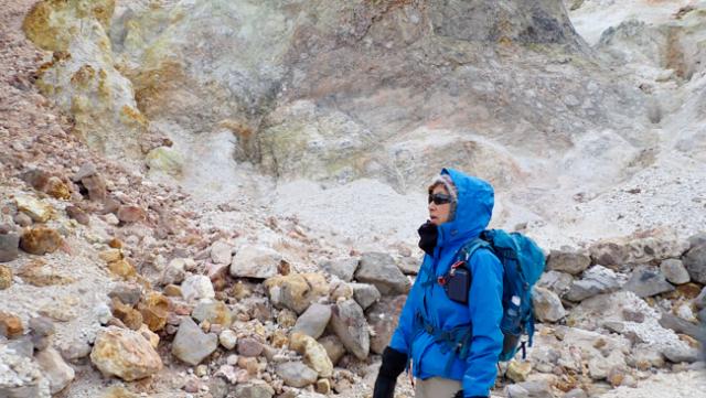 左手にはもくもくと立ち昇る噴煙。荒涼とした白い岩肌と、噴気孔の黄色い硫黄結晶がこの山の険しさを物語ります。