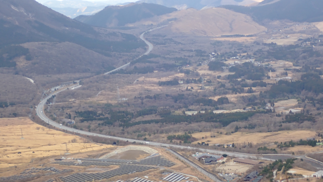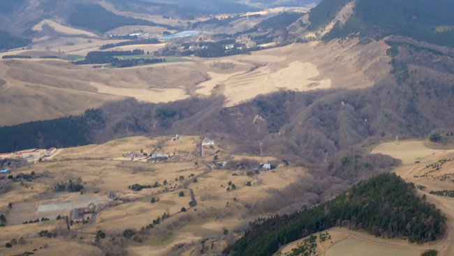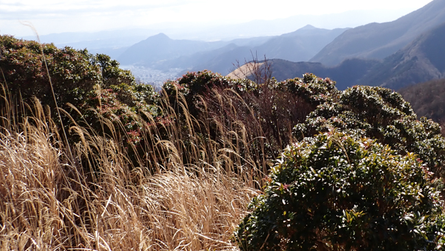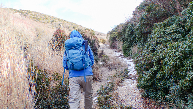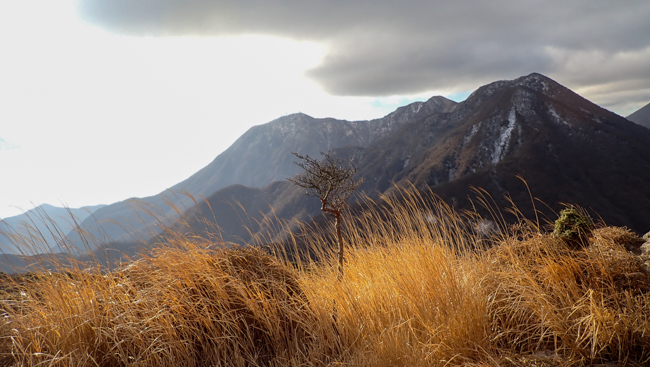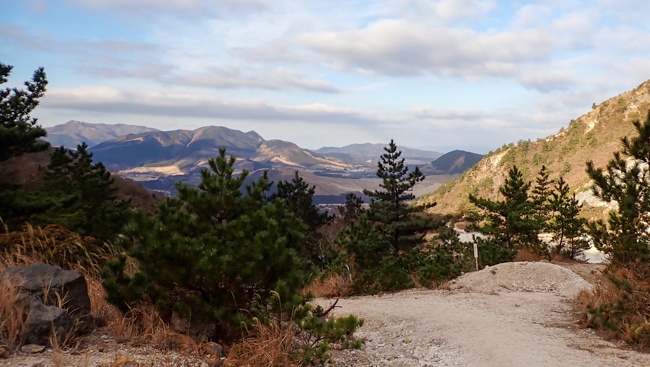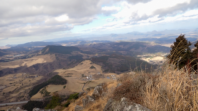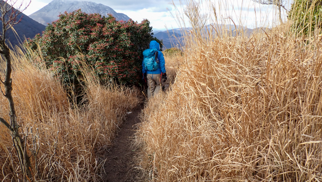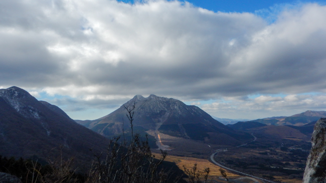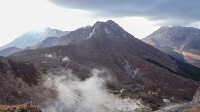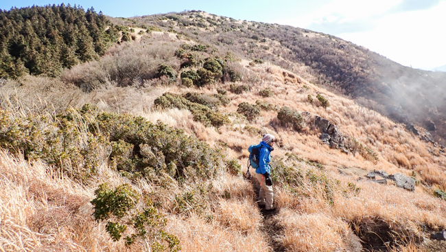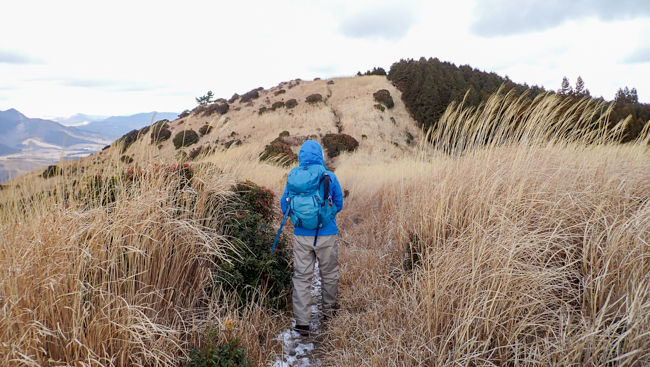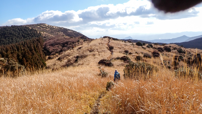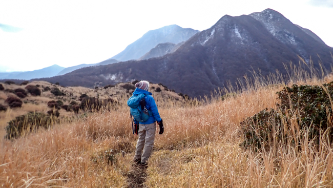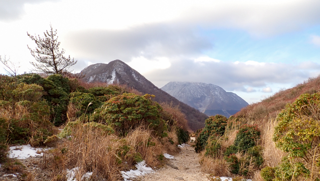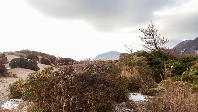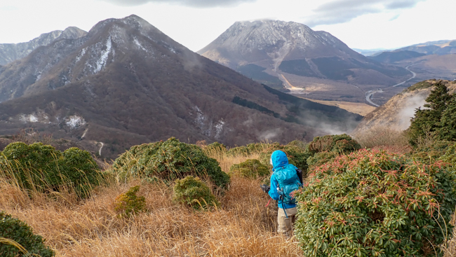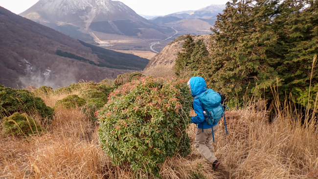 強風も少し和らぎ、ホッと一息。由布岳に見守られながら、ゆっくり下ります。