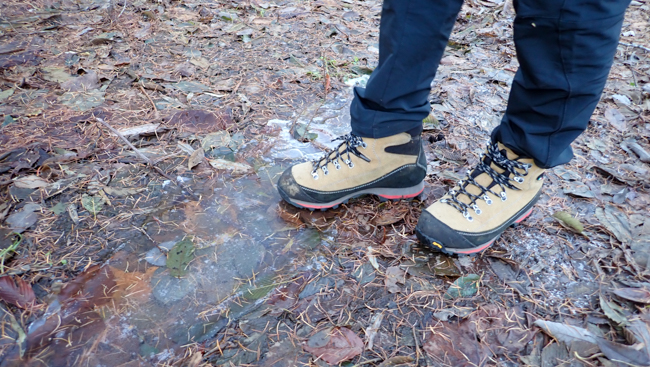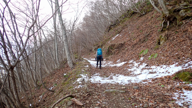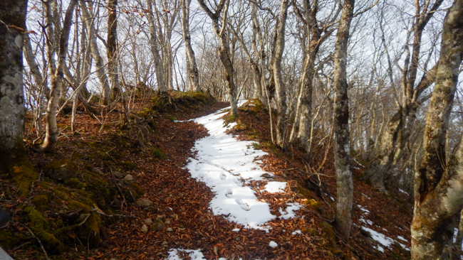 幅の広い歩きやすい道です。雪がチラホラ、水溜りも凍っていま...