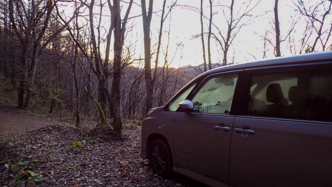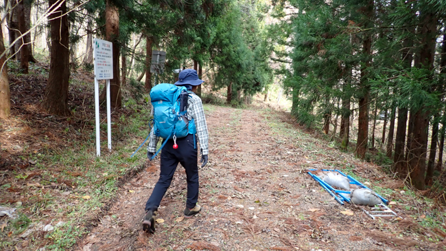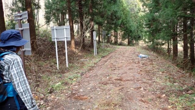 朝の静けさに包まれた登山口へ出発します。 帰りは左の林道か...