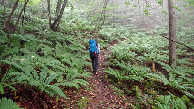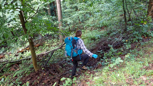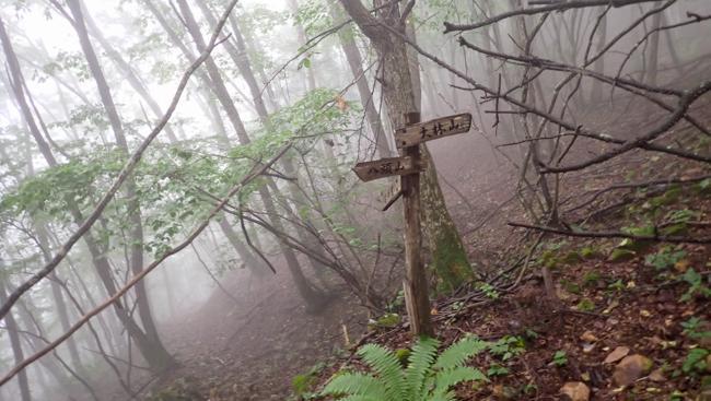 山頂から反対側の急斜面を降り、また林道に戻ります。 ...