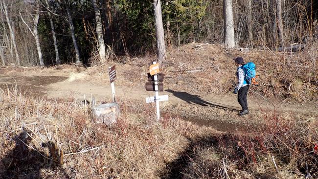 林道途中の分岐点 案内板。左へ行けば木崎湖、右へ進めば...