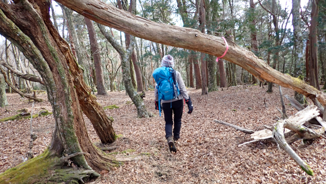 07:45頃 序盤の樹林帯へ。曇り空、強風が唸りを上げてい...