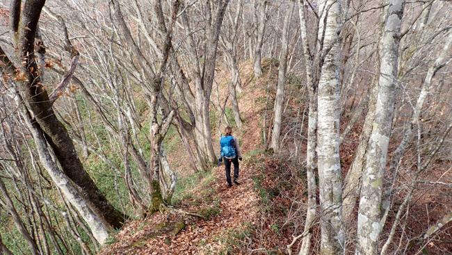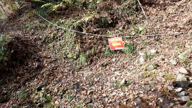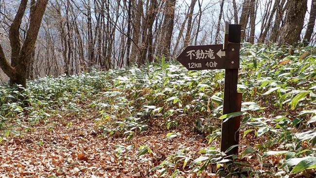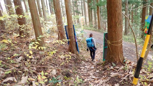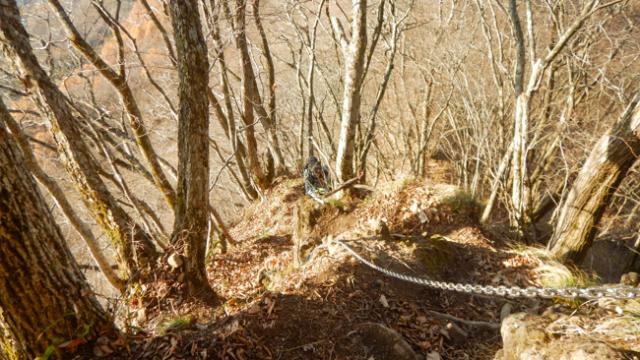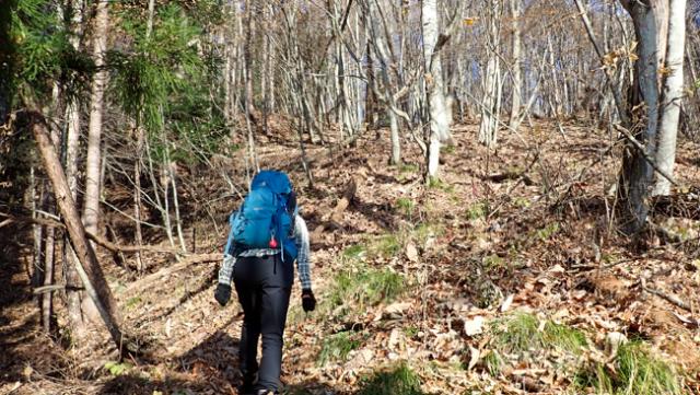 、倒木・根・落ち葉の道になる。道標やテープあり ...