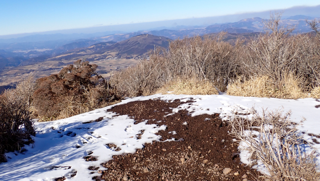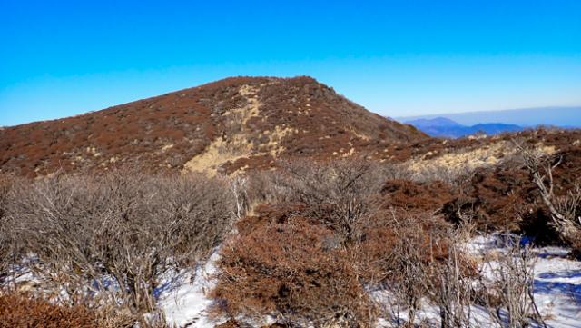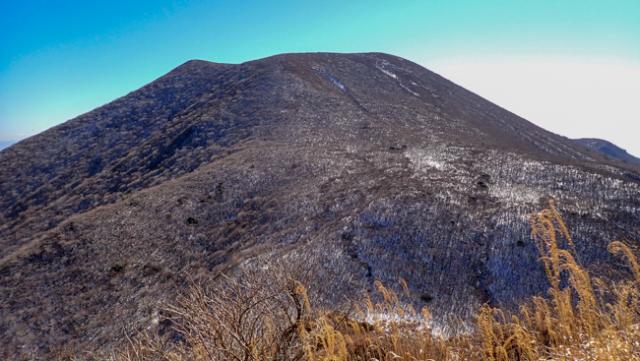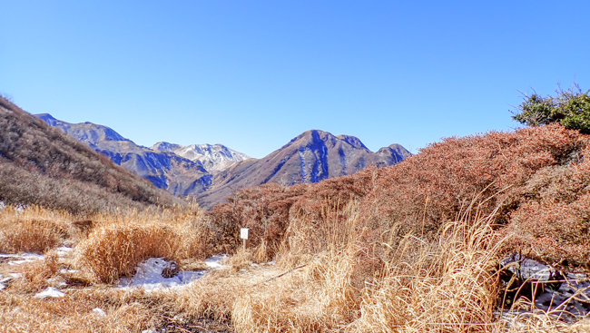 中央:三俣山(みまたやま)三俣山のすぐ左隣、白く雪を被って...
