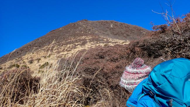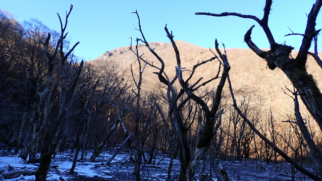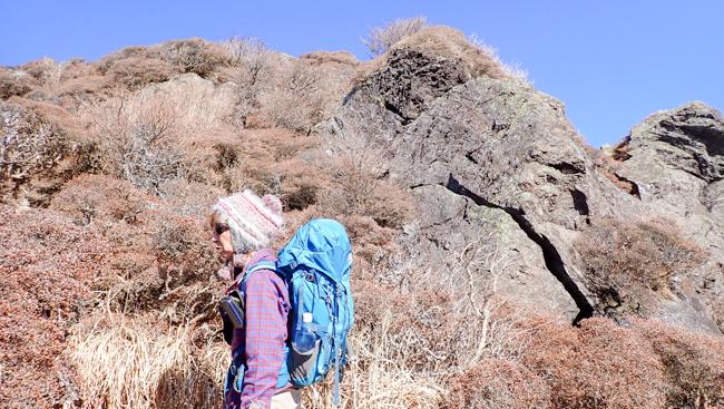視界を遮る木々が消え、眼前に平治岳の巨大な山容 ...
