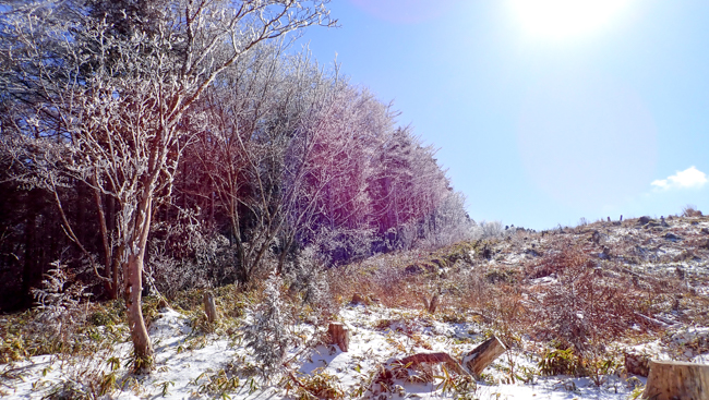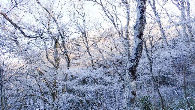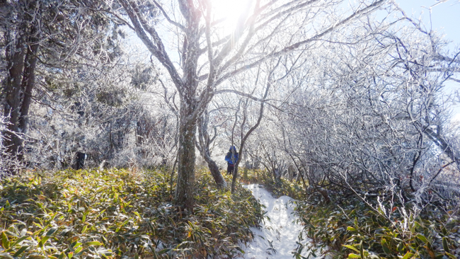 「標高1,100m付近。頭上を覆うブナの枝に積もった雪が、...