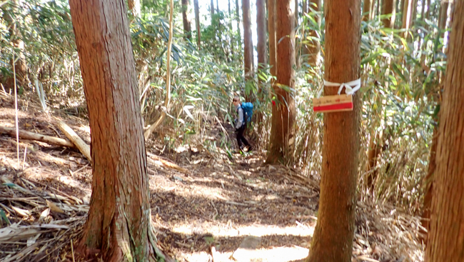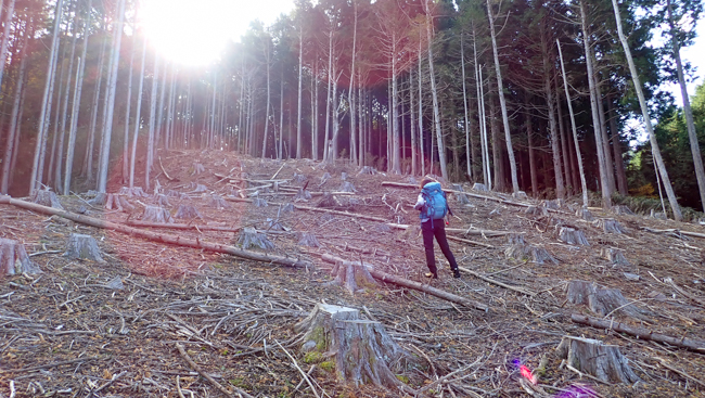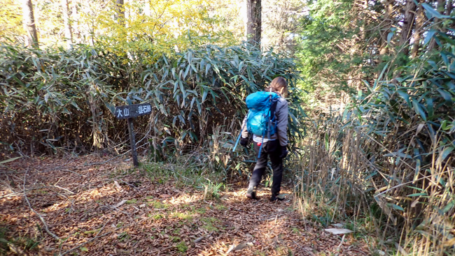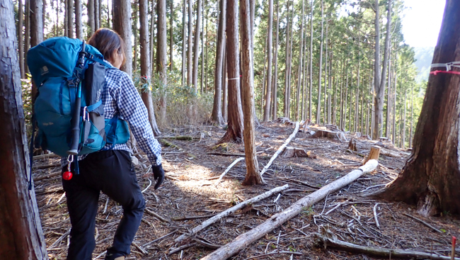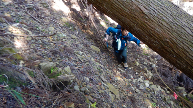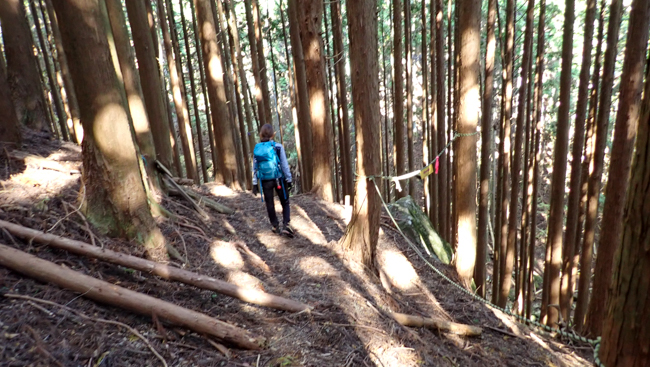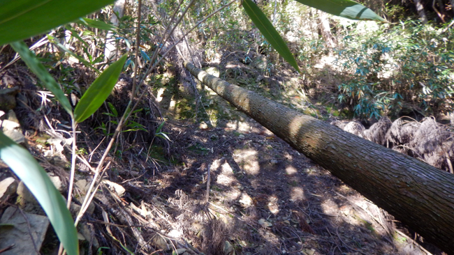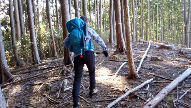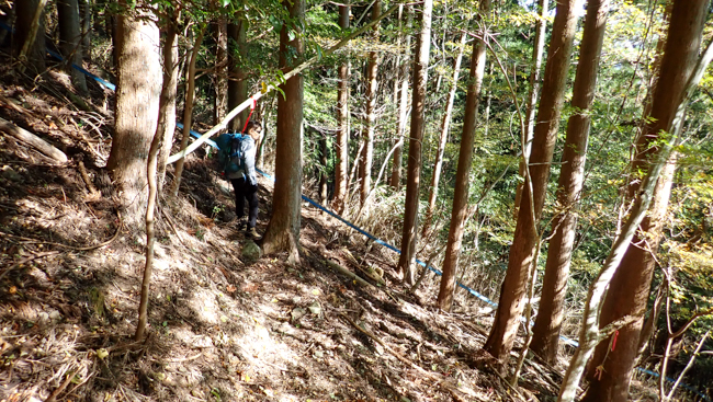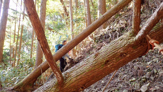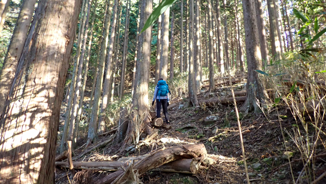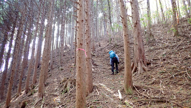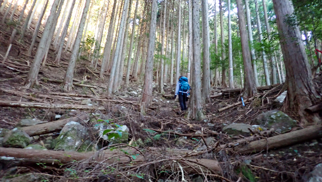 、倒木・根・落ち葉の道になる。道標やテープあり ...