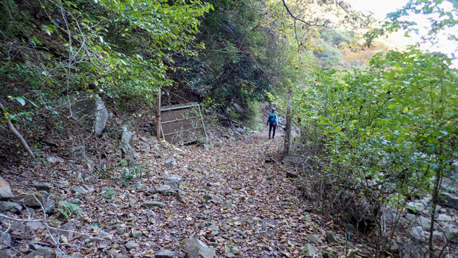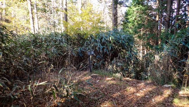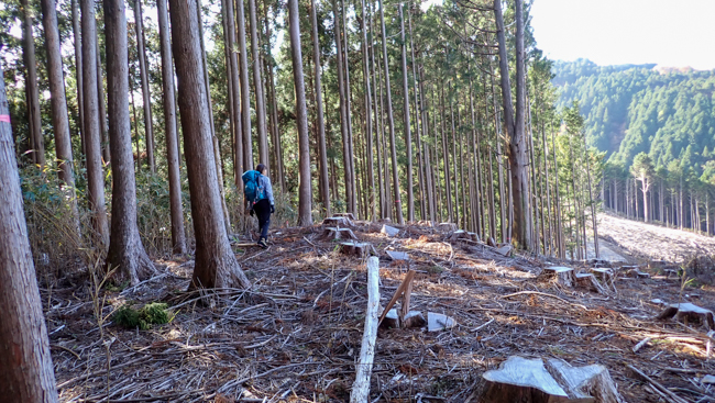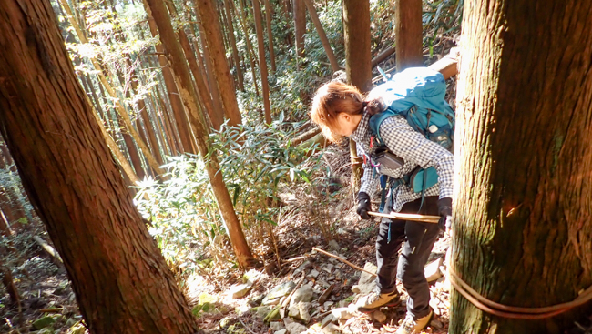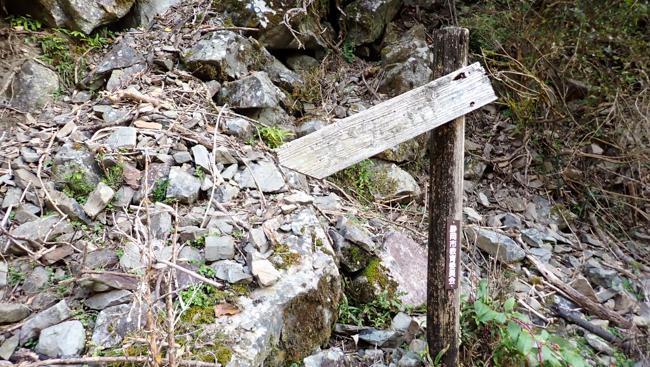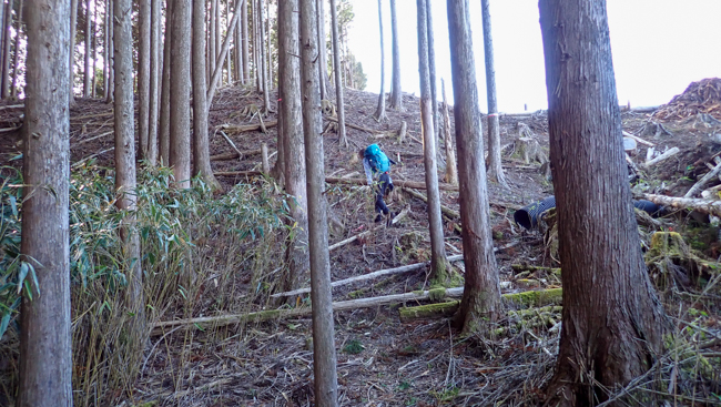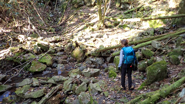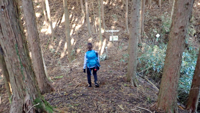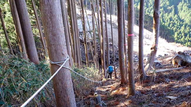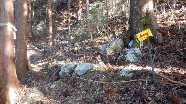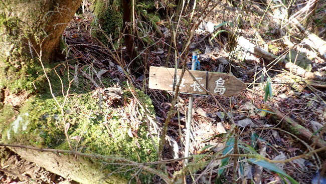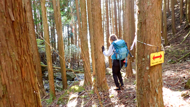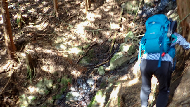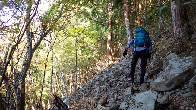 、倒木・根・落ち葉の道になる。道標やテープあり ...