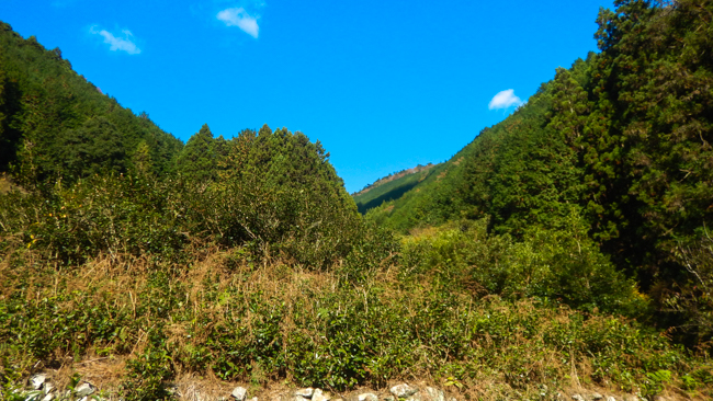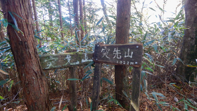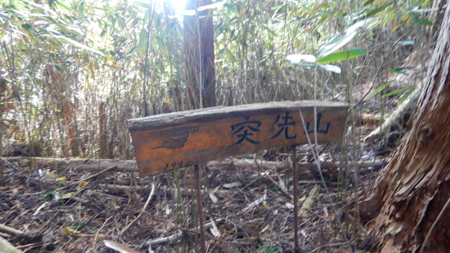 突先山山頂到着。標高約1,020 m。樹林に囲まれ、視界が...