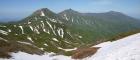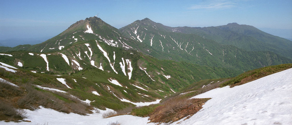 左から、噴煙を上げる「焼山2400.3m」、「火打山2462.0m」、「妙高山2445.9m」である。残雪の白さと新緑が目に眩しい! この景色を見るだけ疲れが吹っ飛ぶ。(機材=CONTAX S2、広角25mmレンズ使用。Photoshopにて二枚の写真を合成してある。)