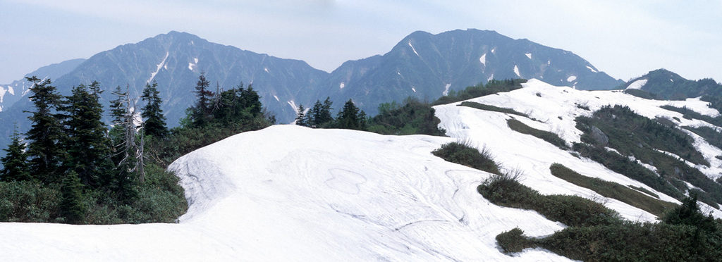 大猫山は、毛勝三山の一峰である「猫又山2378m」から西南西に延びる東芦見尾根上にあり、稜線は豪雪地帯のため豊富な残雪を誇る。前方には、毛勝三山の最高峰である「釜谷山2415m(中央左手)」と「猫又山(中央右手)」が広がる。「毛勝山2414.4m」は、釜谷山に重なり隠れて見えない。剣岳に負けず劣らず、堂々とした山容である。毛勝谷を詰めて三山を縦走し猫又谷を下る環状コース、ブナクラ谷から赤谷山〜池ノ平山〜剣岳本峰に至る北方稜線の難コース等々、この山域への興味は尽きない。大猫山山頂で幾人かの地元登山者に出会ったのだが、いずれも豪脚の持ち主で私では歯が立たない! 機材=CONTAX S2、Photoshopにて2枚の写真を合成してある。