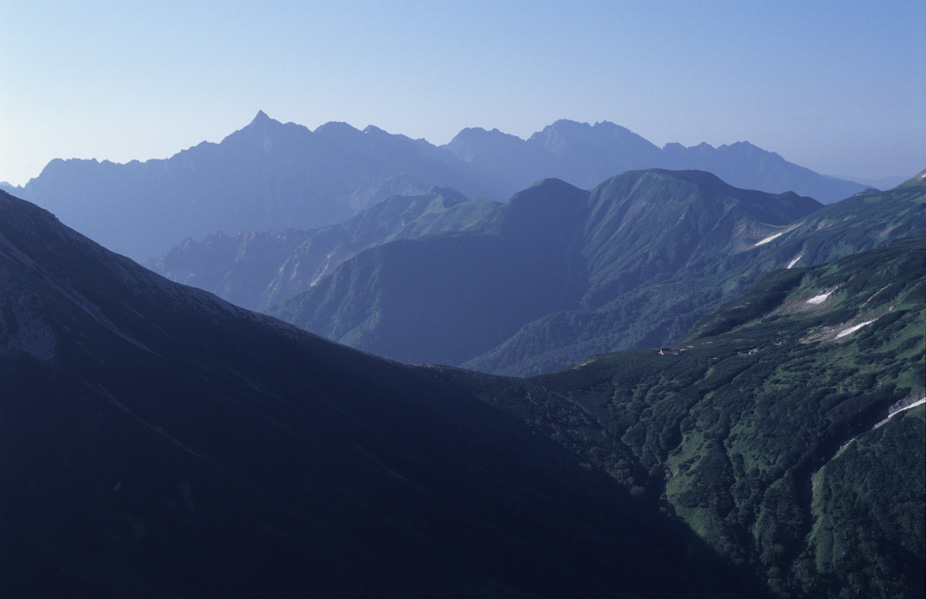 鞍部に三俣山荘とテント場が広がる。今日一日の好天を、約束するような素晴らしい朝である。