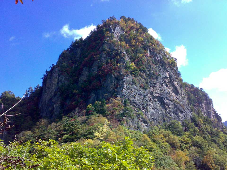 百名山の「両神山1723.5m」西方には、よく整備された八丁峠に向かってギザギザの尾根が延びているが、さらに八丁峠から西に向かって「赤岩尾根」と呼ばれる岩峰連なる未整備のルートが延びていて、近年登山者が増えている。これは、赤岩峠から大ナゲシへと向かう露岩の見晴し台から撮ったものだ。写真からは確認出来ないが、写真中央の岩壁基部に男女ペアーのクライマーが取り付いていて、しばし仲間と登攀の様子を見学した。この山域の岩は脆く、岩壁の所々に生えている木々の根も浅く、転落すれば簡単に支点は抜けてしまう。絶妙のバランスクライミングを、感心していた。機材:ノキアN73(携帯電話)−露光幅が狭いので、カラーバランスが少し崩れている。