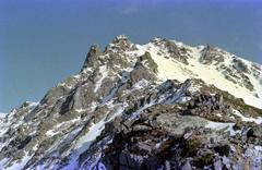 初冬の槍ヶ岳を目指して、新穂高温泉からの日帰り登山に挑戦したことがある。安房峠は冬季閉鎖され、高山経由の大回りなアプローチなので、睡眠は殆どゼロである。人気の無い槍平から中崎尾根に取付くと、西鎌尾根まで膝上のラッセルを強いられた。千丈沢乗越は、強風の為雪が付かない。大槍(槍ヶ岳3180m山頂)と小槍(左の鋭峰)の眺めが素晴らしい!真っ青な青空は、30分も経たないうちにガスに覆い尽くされて、強風と雪が舞い出してきた。槍平へ戻る頃には日は暮れていて、暗闇の中、新穂高温泉に向かって走りに走った。熊や鹿の群れ以外に出会うことのない、長い静かな一日だった。