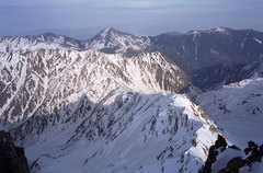 東鎌尾根も険しい山稜である。写真中央やや右手の赤い点は、「ヒュッテ大槍」の屋根で雪に埋もれている。中央奥の三角錐の山は、常念岳2857m。その右手のなだらかな山は、蝶ケ岳2625mである。