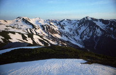 1998年5月5日、北アルプス・樅沢岳2755mより三俣蓮華岳2841.2m(左手の二連の山)と鷲羽岳2924.2m(右手の山)を望む