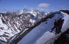 1998年5月4日、弓折岳2588.4mより槍ヶ岳3180mと蒲田川左俣谷を望む