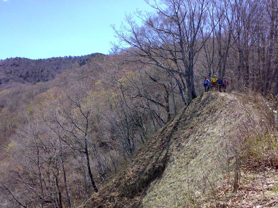 美しい雑木の広がる尾根道。前日の雨に洗われて、澄んだ空が広がっていたが、南アルプスや八ヶ岳・奥秩父の頂稜は厚い雲に覆われていた。北面の谷筋には、残雪がかすかに残り、冷たい風が吹き抜けていました。