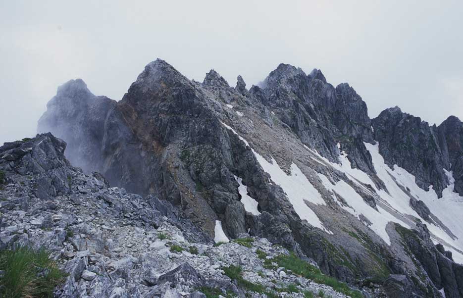 2001年7月21日、長次郎のコルに戻り北方稜線縦走の開始。まず、長次郎ノ頭を乗り越さなければならない。ルートを探索していたら、隣の別パーティが「落ちた!」と叫んでいた。幸い4〜5mばかりスリップしたに過ぎないのだが、何であんな急な岩場を下らなければならないのか?考え込んでしまう。