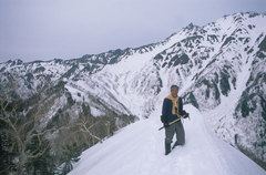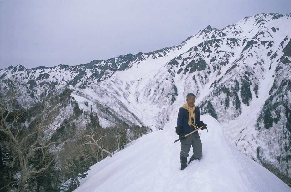 一般の登山者には、槍穂高連峰の景色に目を奪われて見向きもされないが、中崎尾根上の一ピークである「奥丸山」は、展望の良さから地元では以外に人気が高い。ハラハラ・ドキドキの連続で稜線に上がると、槍ヶ岳の展望が広がり嬉しくなった! モデルは、蝸牛山の会の森君。笑ったポーズでいたが、後で「鬼!」と言われた。