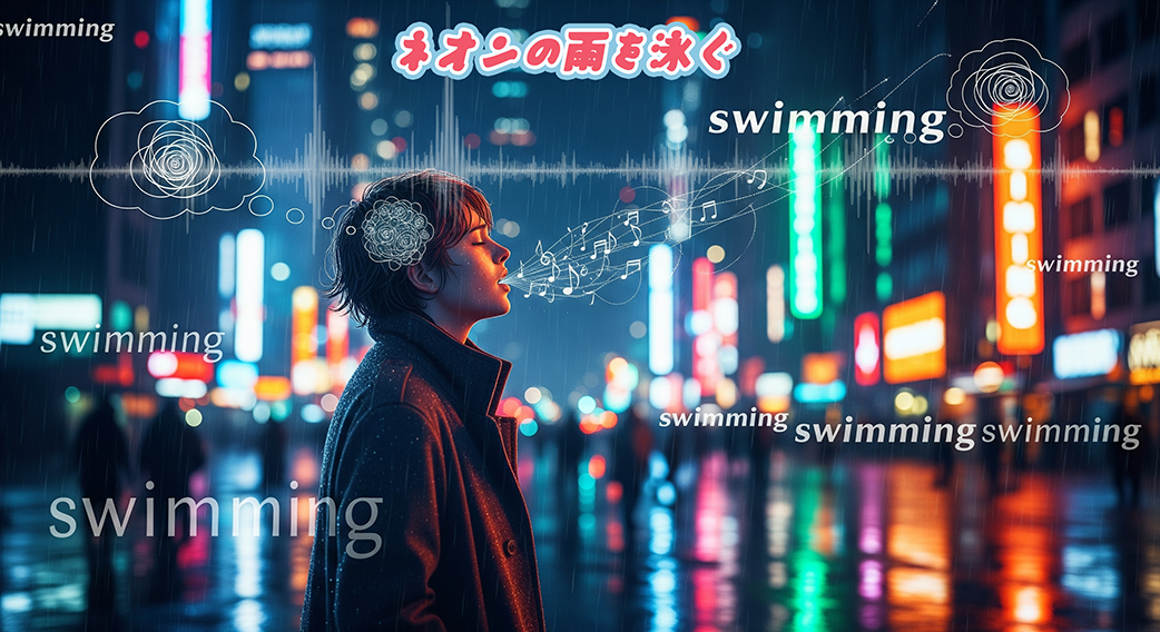 都市の夜を漂う孤独な語り手が、自身の存在を確かめるように歌う。ネオンの光や雑踏のざわめきといった都会の音が、心のノイズや息づかいと重なり、現代社会の無関心や情報過多の中で生きる人間の姿を象徴している。比喩やオノマトペによって、外界と内面の境界が曖昧に揺らぎ、現実と感情が交錯する。リフレインされる「泳ぐ」は、生きることそのものの反復であり、沈みそうになりながらも抗う意志の表れ。冷たい夜景の中で響く声は、誰にも届かないようでいて、同じ孤独を抱える誰かに静かに寄り添っている。 ...