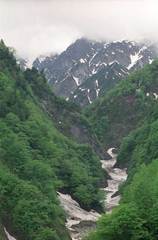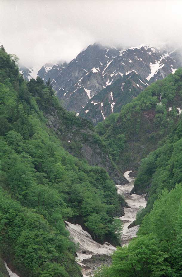 白馬駅から夏山で人気が高い白馬岳2932mの登山口である猿倉に向かう林道を詰める途中に、八方温泉露天風呂「日向の湯」があり、隠れた名湯として結構大勢の登山者や観光客で賑わう。ここは白馬大雪渓下の本流となる松川の分岐点でもあり、橋のたもとからは遠く唐松岳2696mが望まれる。松川は、ここを起点に白馬大雪渓である「北俣入」と唐松谷に向かう「南俣入」に大きく分かれるのだが、唐松岳から一気に落下する「唐松谷」の白い雪渓に目を向ける登山者はほとんど皆無である。写真は。南俣入から見た「唐松谷出合」。正面の岩壁群は、白馬三山〜唐松岳稜線の一角である、天狗ノ頭2812m下の中腹。ガスの切れ間から覗く左手の白い雪渓は、不帰沢である。雪の詰まった狭い陰険な谷間は、唐松谷出合で、この奥には南滝の瀑流が控えている。一般登山者には無縁な、バリエーションの名ルートである!