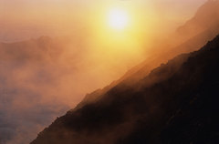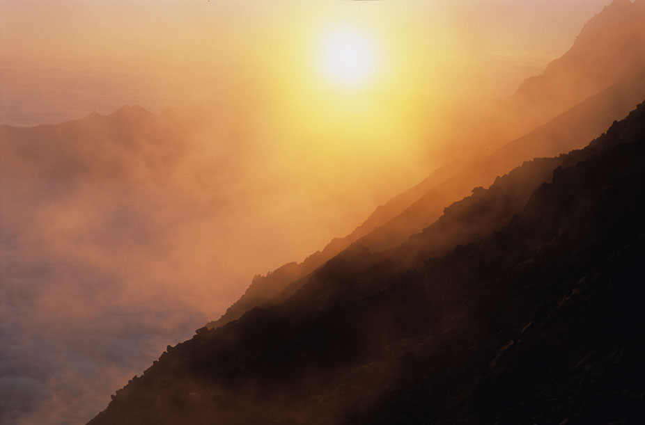 初日は南岳キャンプ地、2日目は穂高岳山荘キャンプ地で幕営した。白出沢の降り口には、大勢の登山者がカメラを構えて日没の写真を狙っていた。「今日は綺麗に染まらないね!」、皆の一様な落胆の声だ。彼らは何処に目を向けているのだろうか? 太陽の真下には「笠ヶ岳2898m」が控えているのだが、眩し過ぎて目に入らない。茜色に染まる雲海の彼方には、白山が印象的な姿で映し出されていた。