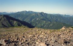 地元、静岡県に住んでいることもあって、南アルプスは山歩きを始めた頃から足蹴に通った山の一つである。白根三山の一角である「間ノ岳3189m」は、平凡過ぎる平らな山頂と日本第二の高峰「北岳3193m」に後れをとっていることもあって、三山縦走する登山者以外は振り向かれない傾向にあるようだ。だが、困惑するくらい広大な山頂からの展望は素晴らしい。写真中央前面の山は、塩見岳3052m」。その後方は、左手から悪沢岳3141m、赤石岳3120m、荒川中岳3083m(赤石岳と重なって見える)と続く。左端は、白根三山の一角「西農鳥岳3050m。間ノ岳は、南アの広がりを寛いだ気分で楽しめる風格のある山である。