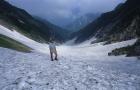 2001年7月21日、小窓にて「小窓雪渓」を俯瞰。モデルは村田君。一緒に歩き出した頃には生徒であったが、2007年の現在では一端のクライマーである。体力・技術ともに私より格段に上である。