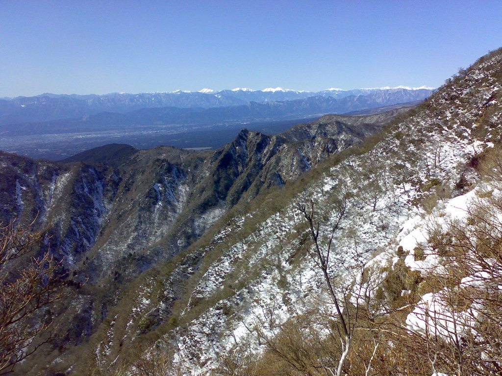 北岳から光岳まで一気に展開する南アルプスの眺めが素晴らしい。正面・三角錐の山が呼子岳で、その右手に険悪の地・鋸岳が続く。最高点である越前岳は、位牌岳の影に隠れて見えない。登山口である沼津市・水神社から「つるべ落しの滝」経由の谷コースから位牌岳山頂に登り、帰路は尾根道である「池の平」コースを下ったが、この日出会った登山者は6〜7名だけで、静かな山歩きだった。池の平コースは道が荒れていて、踏み跡は皆無で、ラッセルと笹原の薮漕ぎで大汗をかいてしまった・・・。