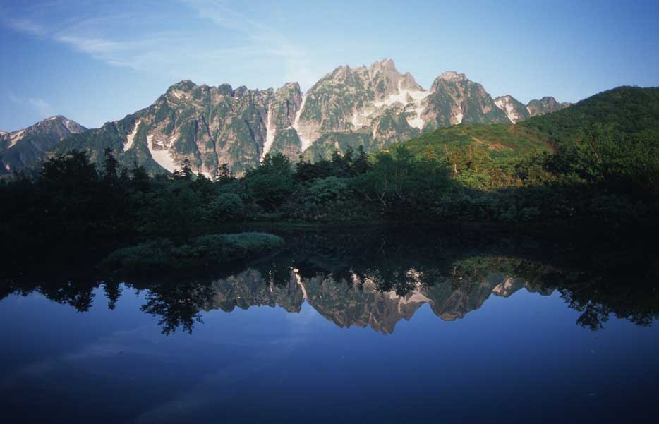 2001年7月22日、仙人池より「裏剣」を写す。湖面に映る剣岳稜線が美しい!池ノ平や仙人池ヒュッテからの「裏剣」は、登山者なら誰でも憧れる景色である。あの険しい稜線を歩いて、この地に辿り着いたから、皆の嬉しさも格別であろう。