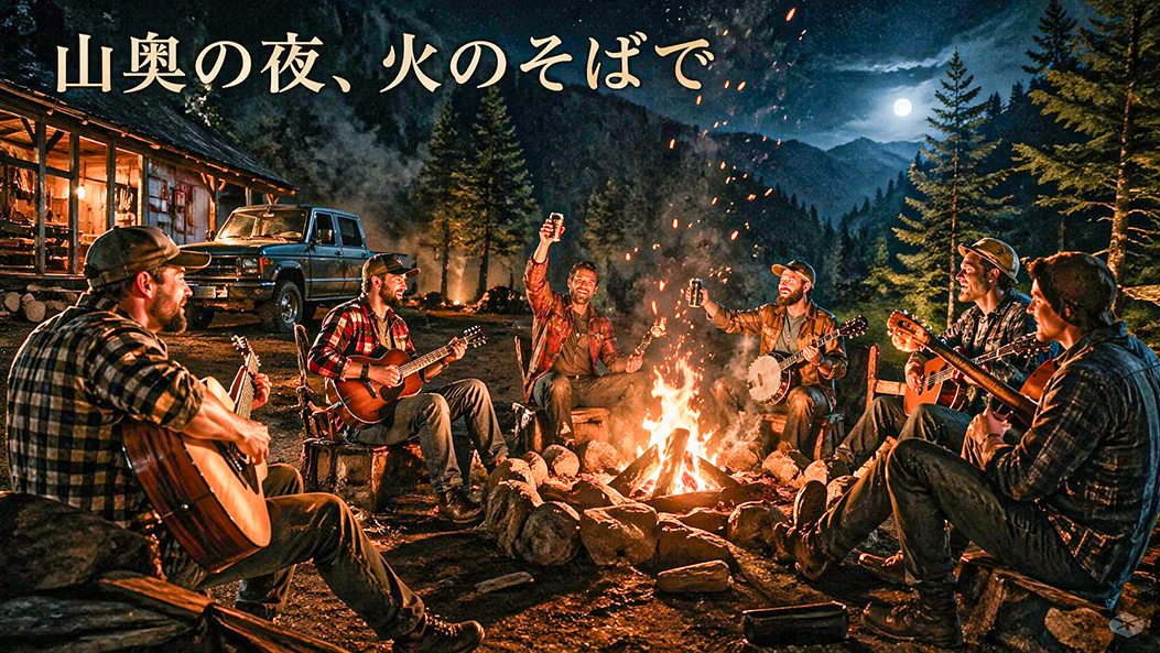 山奥の静かな夜を舞台に、仲間と過ごす一晩の体験を描いた内容。泥だらけの車で集まり、焚き火を囲み、酒と音楽で盛り上がる様子が、内側からの視点で生き生きと表現されている。都会の便利さや評価とは無縁の場所だが、だからこそ感じられる自由や充足が強調されている。何もない環境の中でこそ、自分たちの存在やつながりがはっきりと浮かび上がり、「ここで生きている」という実感が核になっている。曲が進むにつれて感情は高まり、最後にはその瞬間を肯定し、全てを解き放つような頂点へ到達する構成になっている。 ...