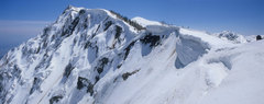 写真中央左奥が爺ヶ岳北峰2631mで、中央右肩に爺ヶ岳南峰も望める。右端は岩小屋沢岳2630m、その左手に針ノ木岳2821mがちょこんと顔をのぞかせている。稜線の左手(大町側)は、幾重にも雪庇が張り出していた。5月15日、画像差替え。機材=CONTAX Aria、25mm広角レンズ、パノラマ合成。