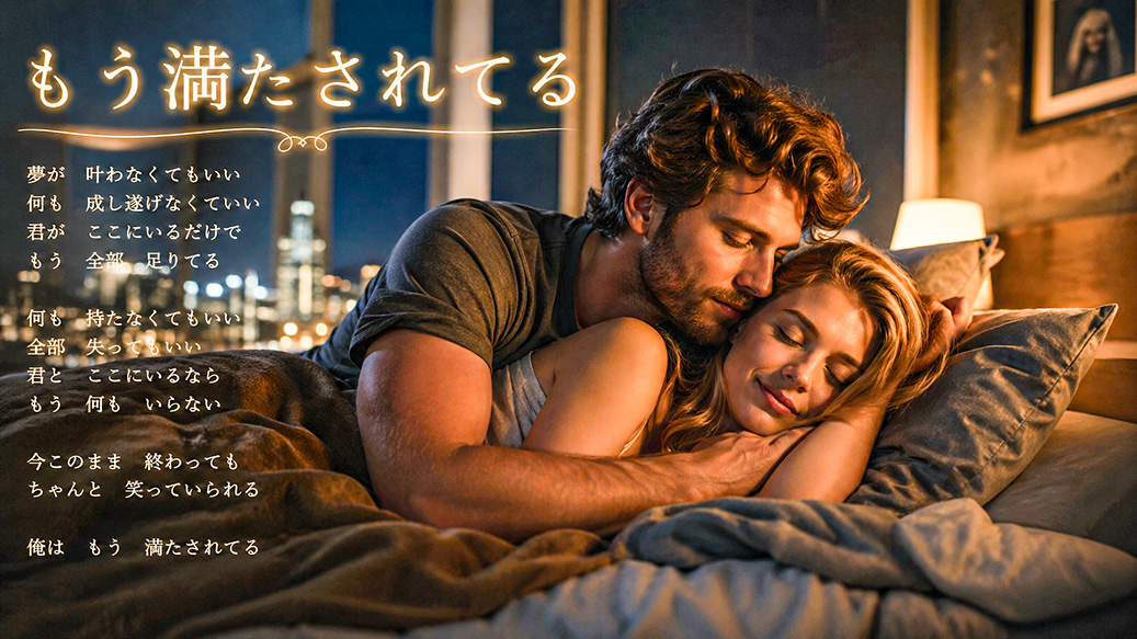 この歌は、日常のごく小さな瞬間を積み重ねることで「もう満たされている」という結論へ到達する構造になっています。序盤は部屋や呼吸、触れる距離といった具体的な描写に限定し、外の世界や夢といった大きな概念はあえて排除されています。中盤で「夢が叶わなくてもいい」「何も成し遂げなくていい」という価値観の転換を提示し、一般的な成功の尺度を否定します。そこからクライマックスでは感情が一気に解放され、「今この瞬間で十分だ」という断定が絶叫として表現されます。静かな親密さから始まり、徐々に熱量を増し、最後に爆発することで、満たされている状態を“説明”ではなく“体感”として伝える構成です。 ...