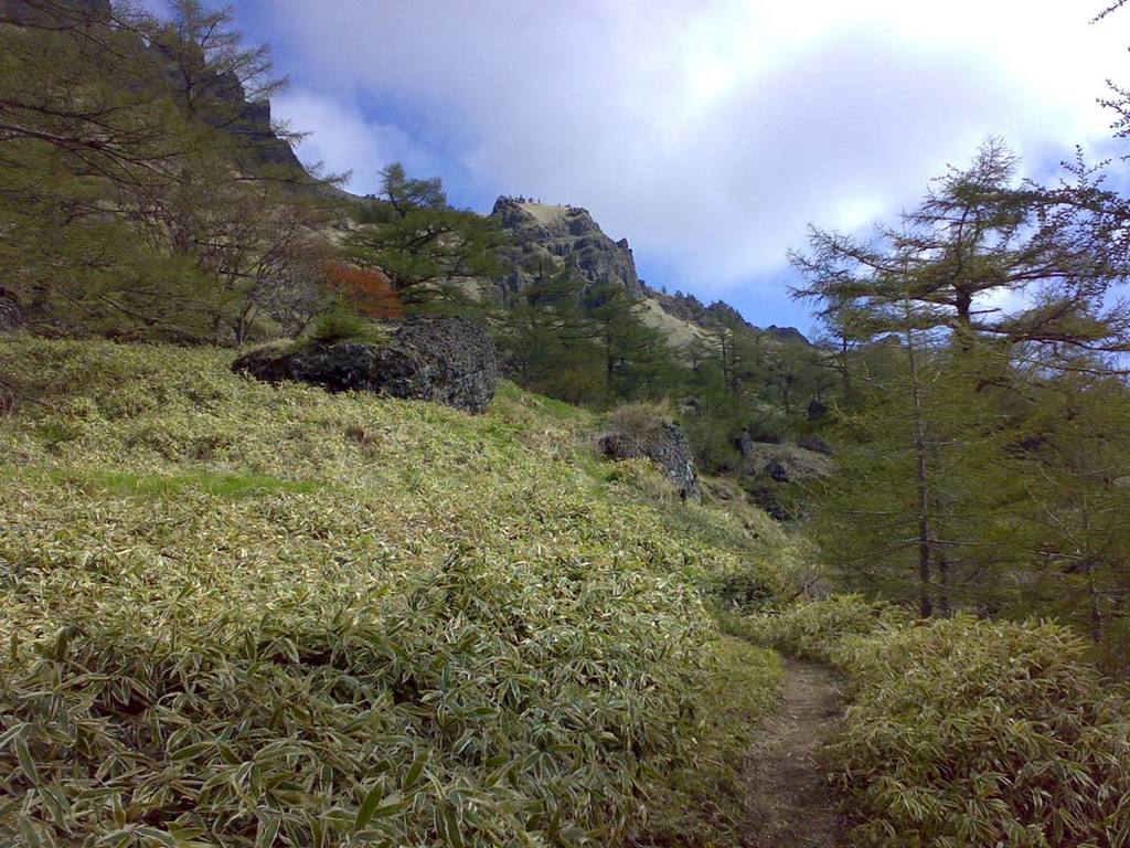 美しい笹原と木立が広がる登山道。浅間山というと、火口だけに目が向きがちだが、登山口である浅間山荘〜湯ノ平コースは、みずみずしい新緑に囲まれた森の中に道で、渓谷には見応えのある滝が連なり、獣の達(カモシカやリスなど)の姿や野鳥の歌声が絶えない。周囲は山菜の宝庫でもあり、何度歩いても飽きのこない心地よいルートである。