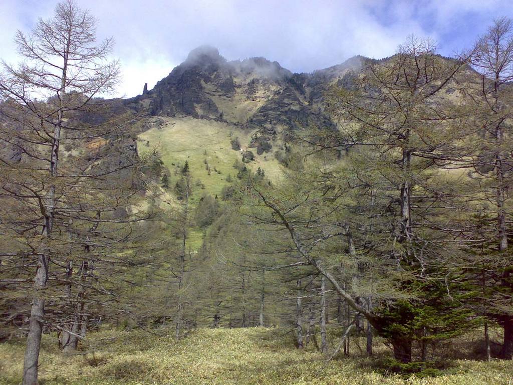 写真中央右手の笹原に、ジグザグの登山道が見える。通称「草すべり」と呼ばれ、湯ノ平から外輪山であるトーミの頭・黒斑山2404m鞍部に続く道で、大変な急登である。カッコーの声が一日中響き、牧歌的で長居をしたくなる景色である。夏はお花畑が広がる別天地でもある。火口山頂を踏めなくても、このコースを歩くだけで満足できるであろう。
