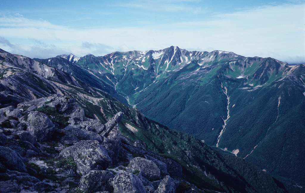 1993年8月16日、北アルプス裏銀座・三ツ岳2845m付近より黒岳(水晶岳)2978mを望む