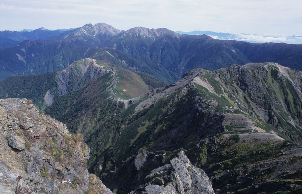 塩見岳東峰より北方を望む。間ノ岳〜北岳に続く稜線が美しい!写真中央右手の最高点は「北俣岳2920m」で、名峰「蝙蝠岳2865m」を経て南アルプス南部の登山口である二軒小屋に下る。写真中央左手のピークは「北荒川岳2698m」で、ここから三峰岳2999m直下の三国平まで樹林の尾根が続く。写真中央奥左手が「間ノ岳3189m」で、その右手には「西農鳥岳3050m」と「農鳥岳3026m」が続く。間ノ岳の左肩には「北岳3193m」が顔を覗かせ、さらにその奥やや左手に「甲斐駒ケ岳2966m」が見える。