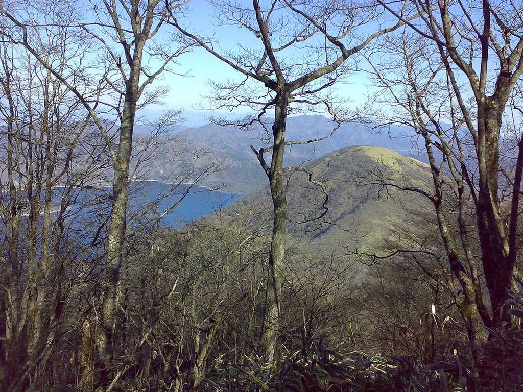 写真は、山頂への登山路から見る本栖湖(富士五湖の一つ)と竜ヶ岳の眺め。後方の山は、御坂山塊である。