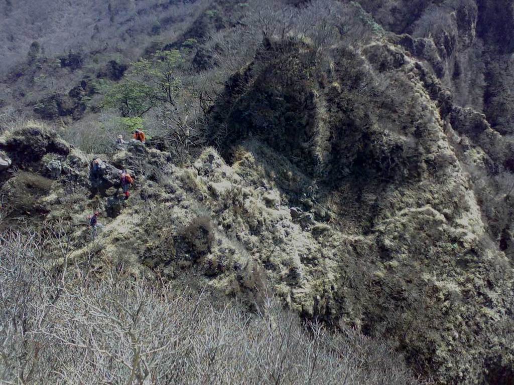 割石峠から蓬莱山は平凡な樹林の尾根歩きだが、一歩鋸岳の縦走路に進むと足が竦んでしまう! 先行パーティーが最初の難関に取り付いている。左から2番目の登山者が、ロープを頼りに急な岩場を攀じ登っているのが見える。遠見からは、そんな急な直登をしなくても、右から簡単に岩場を巻けるのでないかと思っていたが、自分が取り付いてみて直ぐに理解できた。岩場右手はスッパリ切れ落ちていて足場がない・・・。furaibouは強引に空をまたいで乗り越した。ここを通過すると、右手の狭いバンドをトラバースする。雨上がりの割には、足場はしっかりしていて怖くわない。