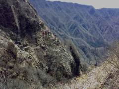 次の難関は・・・、えっ! 先行パーティが見えるが、手掛かり足場は右手の脆いロープ1本で、攀じ登る。