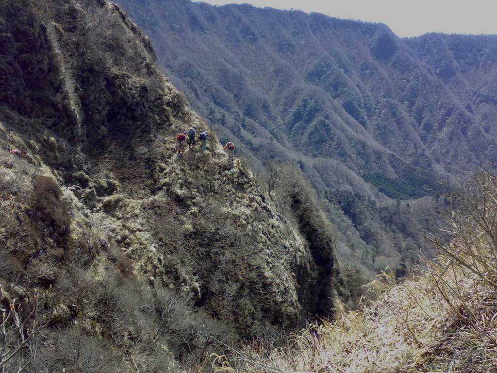 先程の岩場より右手のトラバース道に進む先行パーティ。足元はスッパリ切れ落ちていて高度感たっぷり! このトラバースを過ぎると、その裏手のガレ場を一気に下降する。