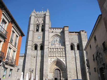 カテドラル(Catedral)。アビラのカテドラルはカスティーリャ・イ・レオンで初のゴシック建築の大聖堂。1160〜80年の間から建築が始まったと言われている。すでに建築が進んでいた城壁に、大聖堂の後陣が重なるように設計されたことから、周囲の城壁に合わせて後陣部分を要塞化することが求められ、まるで城の一部のようにも見えるシモーロ(Cimorro)と呼ばれる塔が配置されている。現在、城壁外側に平行してのびるサン・セグンド通り(アルカーサル門を出て左)から見ることのできるシモーロは、14世紀後半に増築されたもの。カテドラル内部の中央祭壇には、ペドロ・ベルゲーテによるキリストの生涯を描いた祭壇画がある。太陽を受け美しい光を放つステンドグラスは、14〜15世紀のもの。オリジナルの多くは、13世紀にポルトガルのリスボンで起きた大地震により消失してしまった。