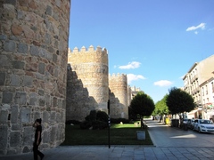 ラス・ムラージャス(Las murallas)城壁から。城壁は全長2,5km、高さ平均12m、幅3m、88以上の塔があり、上から見ると四角い形をしている。城壁の建築が開始された時期については確実性がないと言われているが、様々な文献には11世紀後半からと記されている。一説には1090年から9年間で築かれた…と言われるが、当時の町の社会・経済情勢からそんな短い期間にこのスケールの城壁を完成させることは不可能と推測されている。城壁の多くの区間で、ローマ時代や西ゴート族の遺跡で既に存在していた石碑や城壁が再利用されていることから、当時、この建築に携わっていた人々の知恵と膨大な尽力が感じられる。1135年以降になって、アビラは社会経済が安定してくることから、その他の歴史的要因も重なって、城壁建築が更に進んだと記されている。現在、私達が見ることのできる城壁は12世紀中旬頃に出来たものということは確かのようだ。また城壁には9つの門があり、代表的な2つがアルカーサル門(Puerta del Alcázar)とサン・ビセンテ門(Puerta de San Vicente)。このいずれかを抜けて旧市街の中に進んで行くことになる。