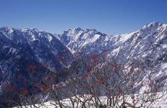 手軽に初冬の山を楽しめる所はないかと云われて、まず思い付くのが後立山連峰の「爺ヶ岳2670m」である。柏原新道の上部は雪で鎖されていたが、登りに使う分には何も支障はない(降雪直後はやばいが)。前景に赤いナナカマドの実、中央の針ノ木岳の左肩には、槍ヶ岳も顔をのぞかせていて、思わず「年賀の写真」はこれ!と、呟いてしまった。私の別な仲間は、槍の北鎌尾根で悪戦苦闘してして、それどころではないと云うのに・・・