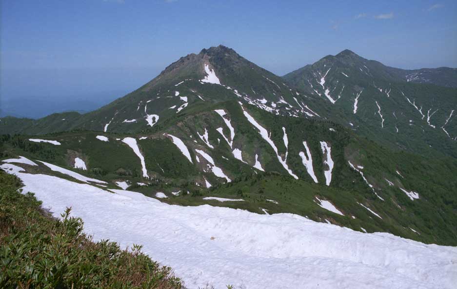 1998年5月31日、頸城(くびき)山塊・金山2246mより焼山〜火打山を写す。
