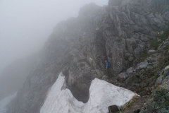 通称「カニのハサミ」と呼ばれる岩場。早月尾根最上部は、主稜線直下まで鎖場が連続する。今年は雨が少なかった為残雪が多く、登山コース上にも雪で覆われた箇所が見受けられる。鎖が完備されて歩行には支障ないが、滑り台状の雪面もあるので、下りは気が抜けない。