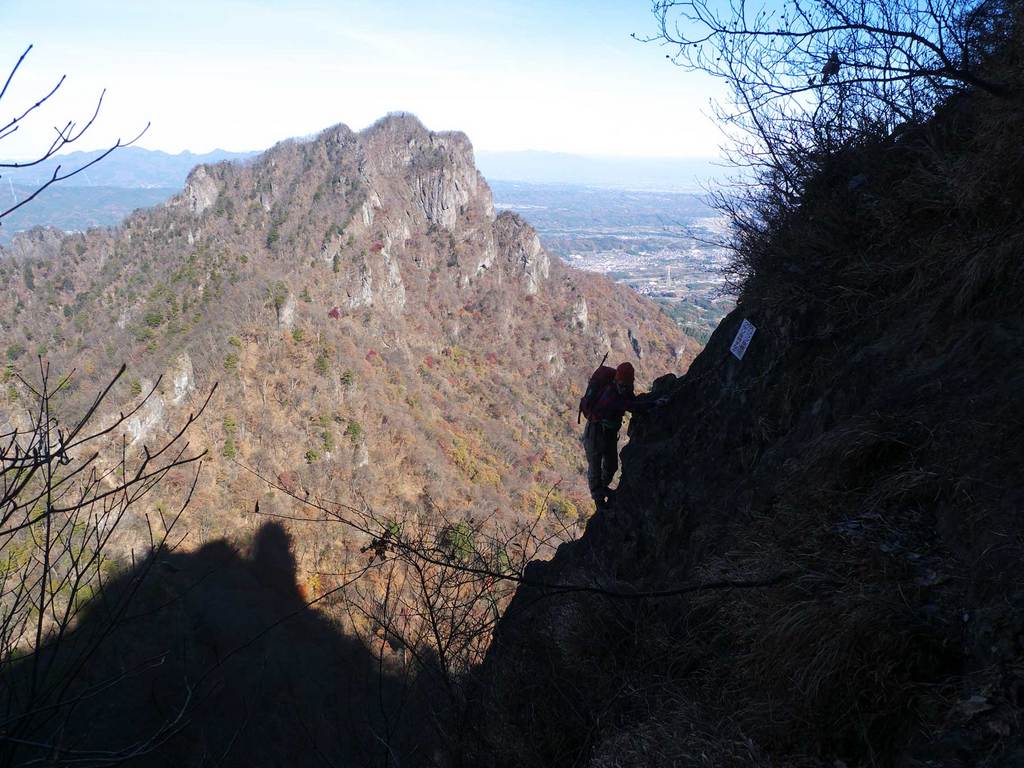 FURAIBOUは、山姥サンのリクエストに答えて、妙義山をお散歩してきました。何回か走破しているので、簡単な山と記憶していたのだが、なかなかスリル満点のハードコースでした。写真は、核心部の「鷹戻し」付近。垂直に近い岩壁を鎖を頼りに10m近く直登し、スッパリ切れ落ちた岩壁を鎖を頼りに6-7m左にトラバース、かぶり気味の岩の乗り越すと、この写真の右上するトラバースとなる。バンド状の傾斜の緩い岩場なので、高度感はあまり感じられないが、スリップすれば100m真っ逆さまに転落することになるので、気が抜けない。この先も60mの梯子が続き、縦走路の下降点まで、油断のならない岩場が連続する。背後の山は、妙義山の最高峰「相馬岳1103.8m」である。