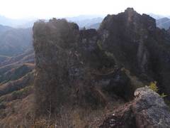 東岳1094mより中ノ岳(左手)と金洞山を望む。峻険な尾根を辿る3人連れの登山者が目に入るだろうか。こんな険しい山に、よく道を造ったものだと、感心してしまう。
